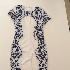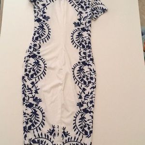 Super shape flattering knee length pencil skirt with blue and white medallion print