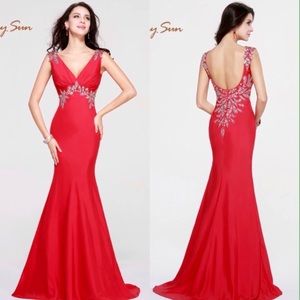 Beautiful long mermaid style prom dress with silver beads and iridescent sequins.