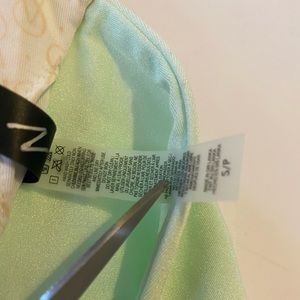 New, but has flaw!!! Size small. Light green. Fabric kind of shimmers (if that makes sense). Has padding.