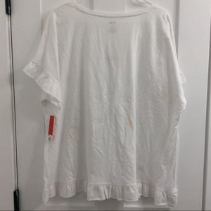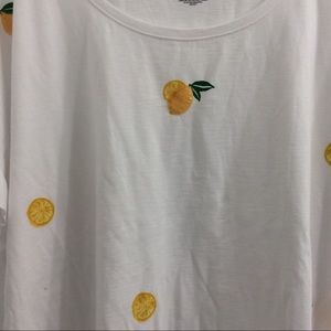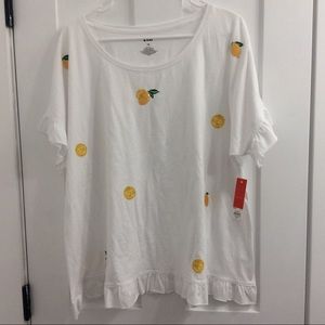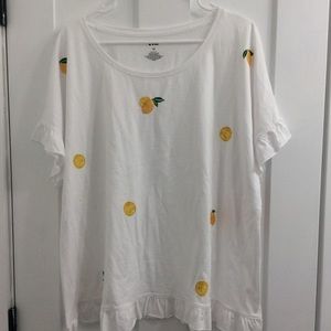 White Short Sleeved Top with Lemons - some with sequins- and ruffle trim at arm and waist
