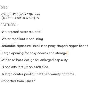 This is a high quality, brand name Uma Hana, Large Opening Cosmetic Bag. It is fashionable & functional with waterproof outer material & water repellent inner lining.