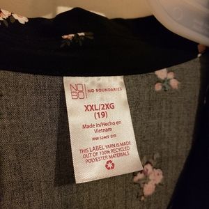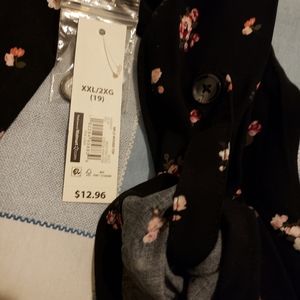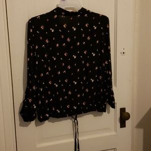 Ladies black floral blouse. NWT - size 2X. It is lightweight, but not sheer. Elastic gathering at waist with tie feature. Sleeves have button up for cuffing. Measures 24" pit to pit, and 23" back of neck to hem. Smoke free home.
