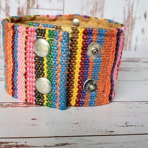 Southwest wrap style bracelet with colorful tapestry fabric lined with soft ultra-suede material. Arrowhead emblem with faux turquoise center stone creates the perfect mix of Boho meets Southwest. Double snap closure for different sized wrists and looks.