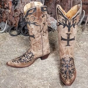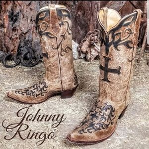 Brand new, Johnny Ringo "Sagrada" factory distressed cowhide, snip toe cowboy boots with overlaid crosses, premium pig lining & leather outsoles made to last! Oh my!😯 They had me at premium pig lining! So soft!🤤 These incredibly gorgeous girls are built like a brick shithouse and ready to rock!🤠