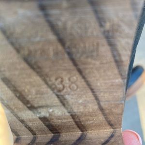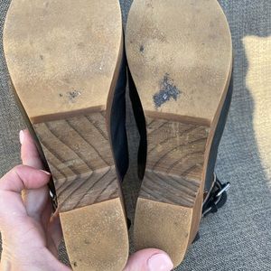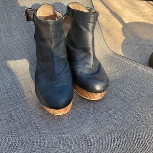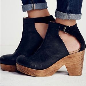 Spanish crafter round-toe leather clogs with side cutouts and a suede backing. Adjustable ankle strap with buckle closure and wooden heels with rubber soles.