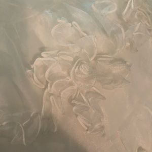 A layer of stiff tulle, a soft lining, and beautiful organza netting with monochromatic flower and ruffle detail.