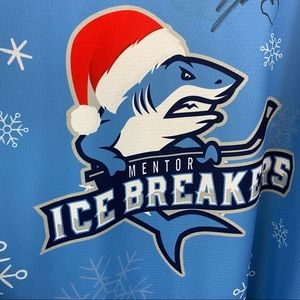 Signed by #7 of the Mentor Ice Breakers. Game worn holiday jersey. Size 54, equivalent to unisex XL