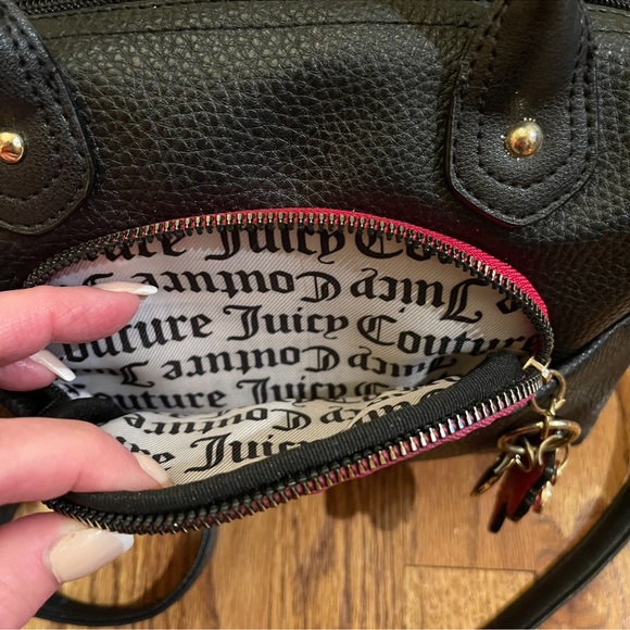 Gorgeous “Charm School” handbag by Juicy Couture! Double handles. Zippered top closure. Adjustable length crossbody removable strap. Elegant gold hardware and charms. Pebbled faux leather. Exterior snap closure and zippered attached coin purse. Gothic printed logo interior. Interior zippered pouch and slip pockets. Measures approximately 8”x 10”x 5”. 100% polyvinyl chloride.