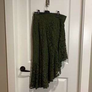 This beautiful skirt is high/low and side buttons with lining under the beautiful flower pattern. Rich hunter green colour. Never worn with tags!