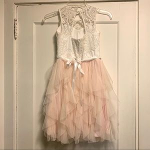 Your little princess will shine when she wears this beautiful dress. Highlighted with a lavishly detailed bodice of lace appliqué with tonal sequins, crystal waist band and cascading mesh skirt. This elegant dress is perfect for birthday parties or a special event.