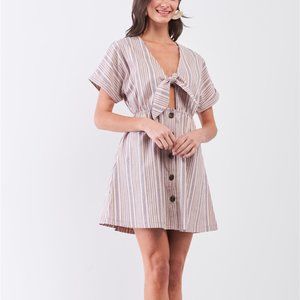 Blush multicolor stripe print mini dress with plunging self-tie V-neckline and cut-out front detail!