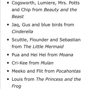 Cogsworth, Lumiere, Mrs. Pots, Chip Beauty and the Beast, Jaq, Gus, Blue Birds Cinderella, Scuttle Flounder, Sebastian Little Mermaid, Pua, Hei Hei Moana, Cri-Kee Mulan, Meeko, Flit Pocahontas, Louis Princess and the Frog