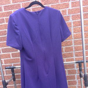 This vintage dress is in great shape and is solidly constructed. It features front and back darts, shoulder pads, and a long skirt. The dress is fitted without being too tight. The dress is a size 12, and fits like a modern size 12. The royal purple color is lovely!