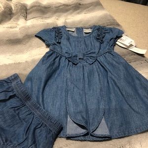0-6 moth pretty as a bow, denim blue dress with ruffles and cascading bow detail. New with tags! Coordinating sweater also available to bundle for discount!