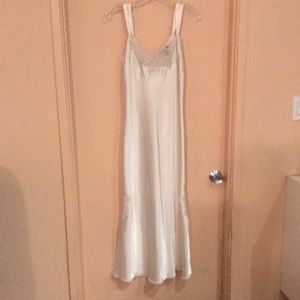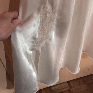 Used as a movie prop back in the late 80s/early 90s, beautiful, mid shin/ankle length, ivory satin gown, with lace detailing on chest, top of 12” side slits, edge of slits and bottom of gown. Cute satin flat, mini, bow on front, satin straps with nice wrap around detailing. Size S-fit is AMAZING! Would make any groom’s eyes pop out and jaw hit the floor! Absolutely stunning on!