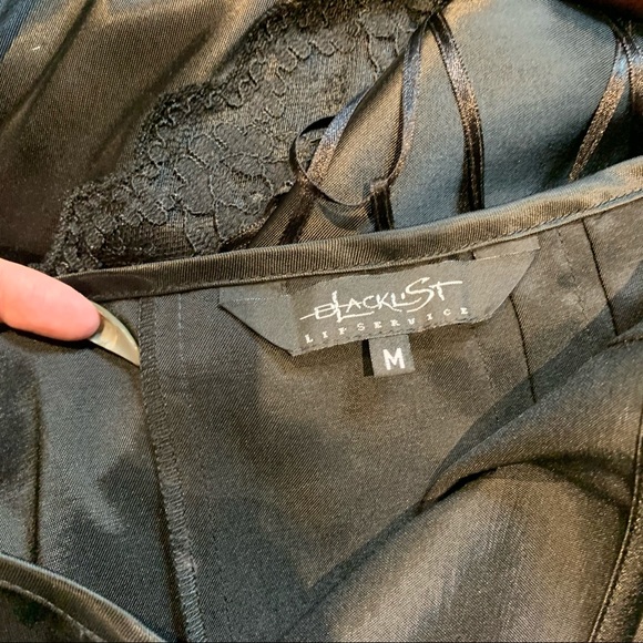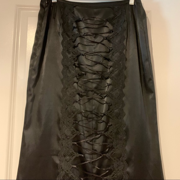 Satin maxi skirt with long pointed train, pin tuck details, corset laced back, and lace trim. I have 2 black available, both medium.