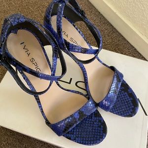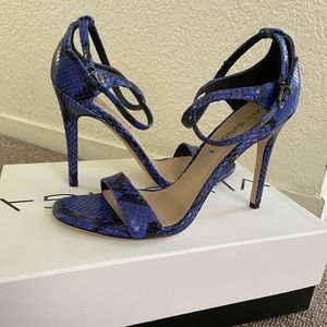 Crossed strap sandal with an allover snake pattern and adjustable ankle buckle, cobalt blue leather. Size 8.5. Used couple times in excellent condition!