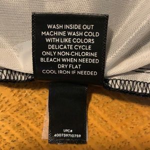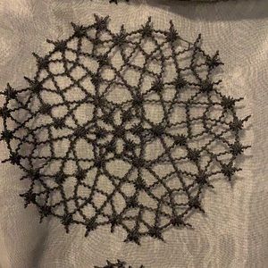 Beautiful, embroidered web-like designs on a sheer front over a white silky lining. The back is plain black, stretchy rayon. NWOT.