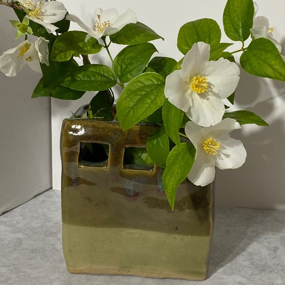 Lovely ombré olive/green with turquoise & maroon accents. Deep teal color on the inside of this! Very unique heavy (weighs 2.5 lb.) slab vase that has been hand-thrown by the potter, who signed the bottom of vase. Neat little window cut outs on each side!