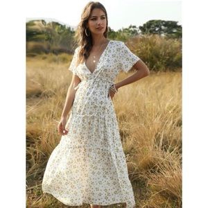 Boho dress sexy dress summer beach style. V-neck, side drawstring High Waist. Hem side slit, short slip lining. Poly