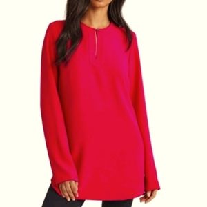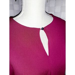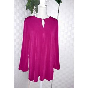 Lauren Ralph Lauren keyhole front georgette tunic blouse, in color dark reddish fushia, looks more red than pink in actual color, features open neckline with single button closure, pullover stylen long sleeves that bell at end, slit sides at straight hemline. 95% polyesyer; 5% spandex, very stretchy. UEC excellent condition see images #4 - #16. Women's size XL = 16 measures at bust approx. 42.5". Retail $99.50. Fire_Attire $53 with discounted shipping.