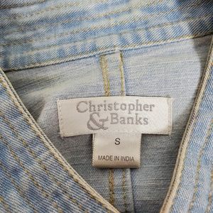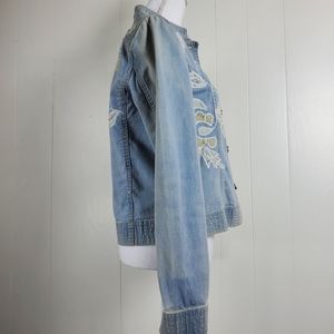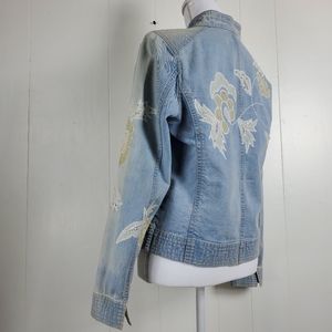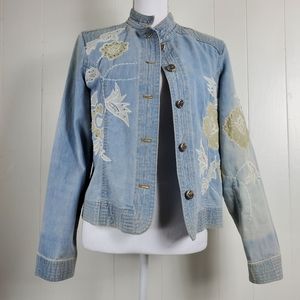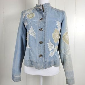 This high quality jacket is made by Christopher & Banks. It features floral embroidery, a button front and is a size small. It has approximate measurements laying flat from armpit to armpit of 19", waist is 18.5", shoulder to wrist is 23.5 ", front length is 19", and back length is 21". It has no signs of wear or damage. Item # J000884