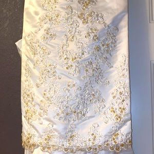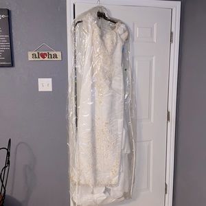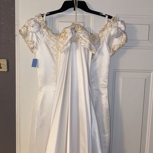 Embroidered in all pearls. Elegant designer dress. Honestly these pictures don’t do it justice. Dress is beautiful in person and brand new, never worn beautiful piece. (Tail is attached in the back)