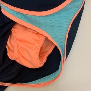 Keywords: athlete, athletic, running, exercise, workout shorts, lined athletic shorts, cross country, track shorts, track and field, summer shorts, lined running shorts, nike drifit, Nike shorts, orange and blue, aqua blue, built in liner, womens running shorts, tempo shorts