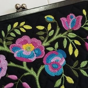 EUC (used once). Fun Vera Bradley kisslock clutch (little strap can be used or tucked away). Beautiful vibrant color embroidery on black soft quilted microfiber. Gorgeous little bag!
