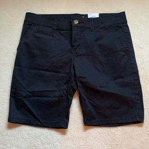 So brand by Kohl’s black shorts. These are 98% cotton, 2 % Spandex. These are so nice, 2 side slant pockets in front, 2 slit pockets with button in back. These can be dressed up or casual. Smoke free home, née with tags and extra buttons attached.