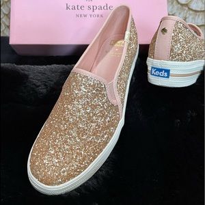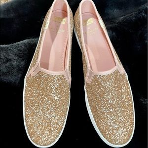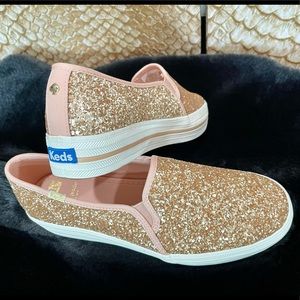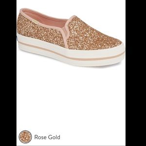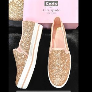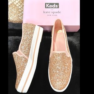 Signature Keds style and kate spade new york's undeniable charm combine on this essential slip-on sneaker that's doused in glitter and lofted by a platform rubber sole. True to size. - 1 1/4" platform (size 8.5) - Slip-on style - Cushioned footbed - Textile upper and lining/rubber sole