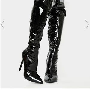 (Unworn) Dolls Kill Black Vinyl Thigh High Boots (Stretchy).