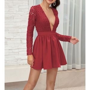 Red Plunge Guipure Lace Long Sleeve Skater Dress