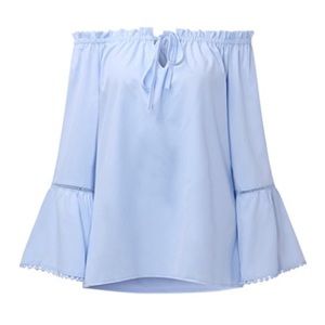 This beautiful blouse has a romantic ruffled look, retro bell sleeves, and a perfectly on trend off shoulder style with a split front and a tie for a perfect fit. Comfortable and easy to wear, this blouse easily dresses up for date night or down for a casual, boho look. Relaxed fit, but order up one size if you want an oversized look.