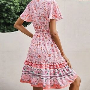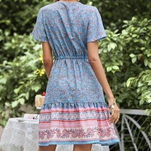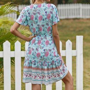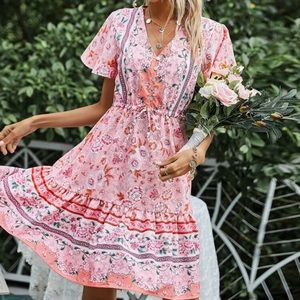 Floral print short sleeve v neck dress button up top half cinch waist tie ruffle tier hem