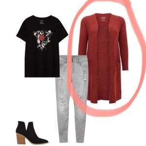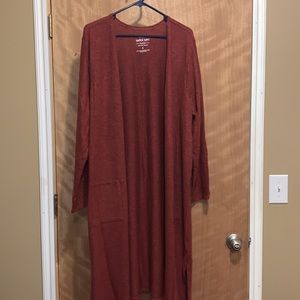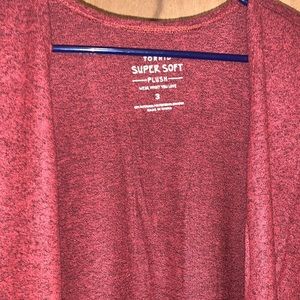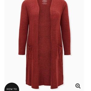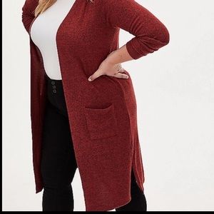 Super soft rust red open Cardigan sweater from Torrid in size 3X & 5X. Brand with tags still on. Super soft plush knit fabric, open front, front pockets, long sleeves, has a I split on the side of the cardigan. Long line silhouette, Rayon, polyester, spandex. Wash cold; dry flat. Same day shipping or next day. Smoke Free Home.