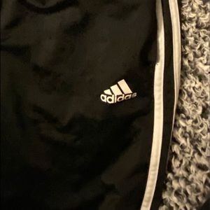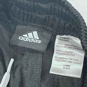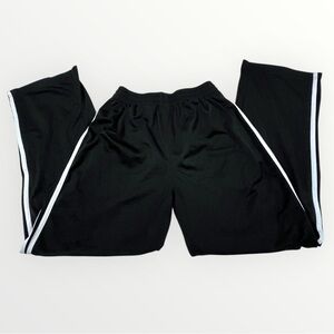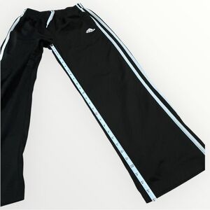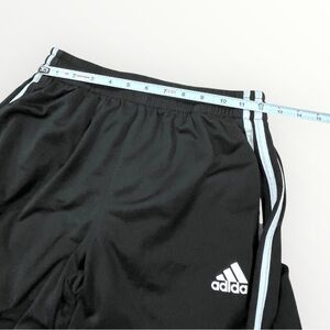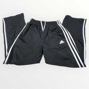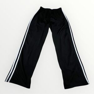 Adidas black track sweatpants with triple white stripes, logo at left pocket. Elastic waist with drawstring, functional pockets. Great preowned condition! See details and measurements in photos!