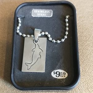 NWT Stainless steel shark cut out dog tag necklace. Comes in little metal pill box.