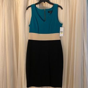 Fitted multi-color dress hits just above the knee. Nice, thick material— and take a look at the fun back zipper! New with tags NWT.