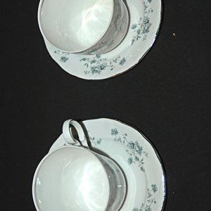 Two (2) German mid-century vintage Johann Haviland Bavaria (Made in Germany) 2 Cups & 2 Saucers with platinum silver rim around edge of saucers and platinum silver rim on inside of cups & handles of cups in very nice condition. Special