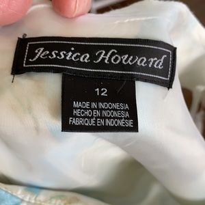 Sleeveless Jessica Howard wide-pleated party wedding cocktail dress in blue, aqua, taupe floral. Satin. Skinny belt loops, no belt. Back zip. Lined. Worn once, cleaned and pressed. Waist 16.5” flat. Underarm to underarm 19” flat. Scoop neck front, slight scoop back. 37” length from back zipper. I’m about 5’7”, falls just above my knees.