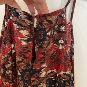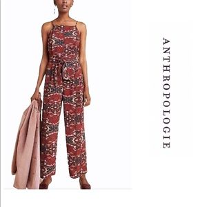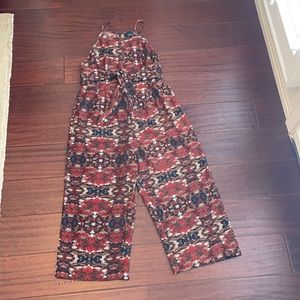 Poly knit jumpsuit by Greylin. Chic print in colors of red, brown, cream, navy and black. Tie front, side pockets, back zip with hook and eye closure, slight wide leg. Perfect for travel, fabric is wrinkle resistant. Dress up or down. 52”L shoulder to hem, 18” across the chest, 16.5” across the waist, 35” waist to hem, 22” inseam. Worn once and in perfect condition!