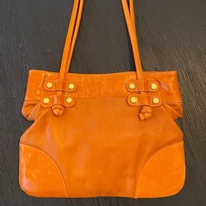 Vintage Pietro Alessandro New York handbag. Classy worn look as designed. Orange soft Italian leather. Inside pockets with one zipper pocket. Snap closure. Bag expands 3 inches! 13”x10” (13” expanded) Strap drop 13”.