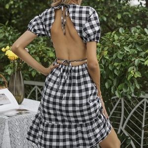 Black white puff sleeve short sleeve backless tie gingham plaid sun dress ruffle tier tiered hem