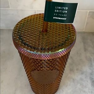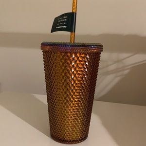 New Starbucks limited edition 16 oz tumbler. Really cool color looks gold ish orange and has some purple glitter to it.