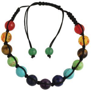 Grab this beautiful Rainbow Chakra Stone Bead Pull Bracelet. Stones of every color decorate this stunning multi color stone bead pull bracelet. Set in chakra stone alignment, these round natural stone beads are woven with black cord and finish with green stone pull ties. This beautiful rainbow stone bead bracelet is great alone or in layers. Genuine stone pull bracelet.