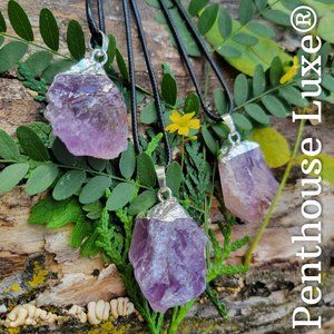 Raw Amethyst chunk, lightly tumbled, with silver electroplated over brass. Adjustable cord. These necklaces are made with REAL amethyst, so they're perfect for those interested in chakra, reiki, and meditation! Pendant chosen at random.
