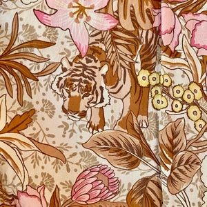 The stunning Spell Jungle Mini Dress is a feminine & flirty style full of eye-catching details, featuring a menagerie of flora & fauna that will have you lost in a whimsical paradise. Enchantingly beautiful, romantic & flowy, in soft hues of cream, dusty pink, yellow & brown. With ornate lace trim, flounce sleeves, coconut shell button down front, elasticized waistband & front pockets trimmed with lace. Gorgeous with boho boots or sandals. 100% rayon. Approximate bust 17β, length 31 1/2β. Like new π·