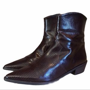 Excellent condition. Free People brown leather embossed western style boots with inner zip closure. Pointy toe, approx 1.5-1.75” heels, minor wear on bottoms. Size 40.