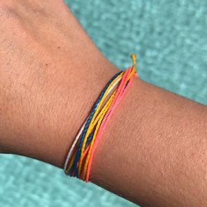 Comes with one is blue, yellow, white, and coral bracelet, a bag, and a Pura Vida sticker!